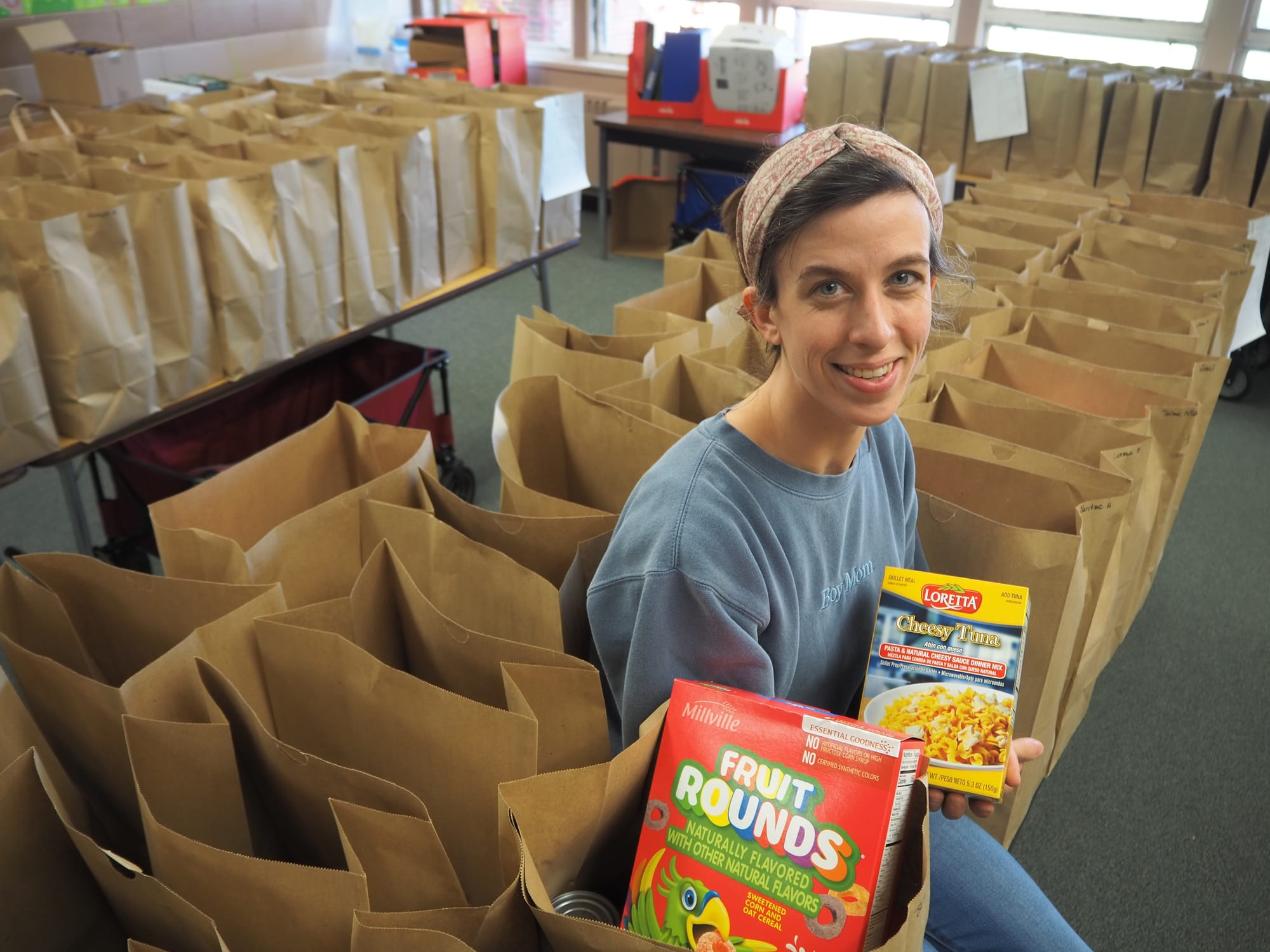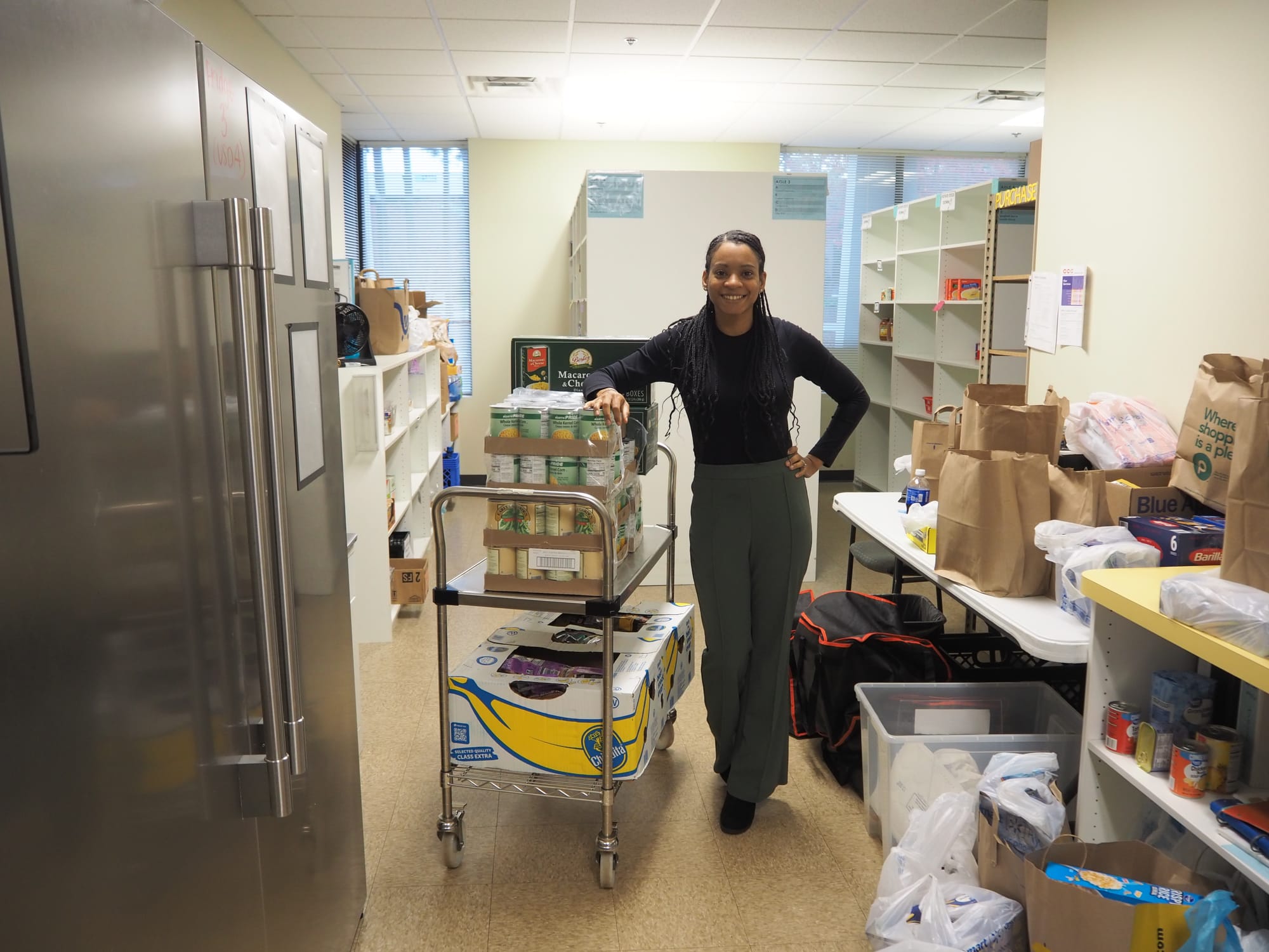 Georgina, a woman who works at a sign-making company down the street from the food pantry, emerged beaming with a box and a bag filled with food.