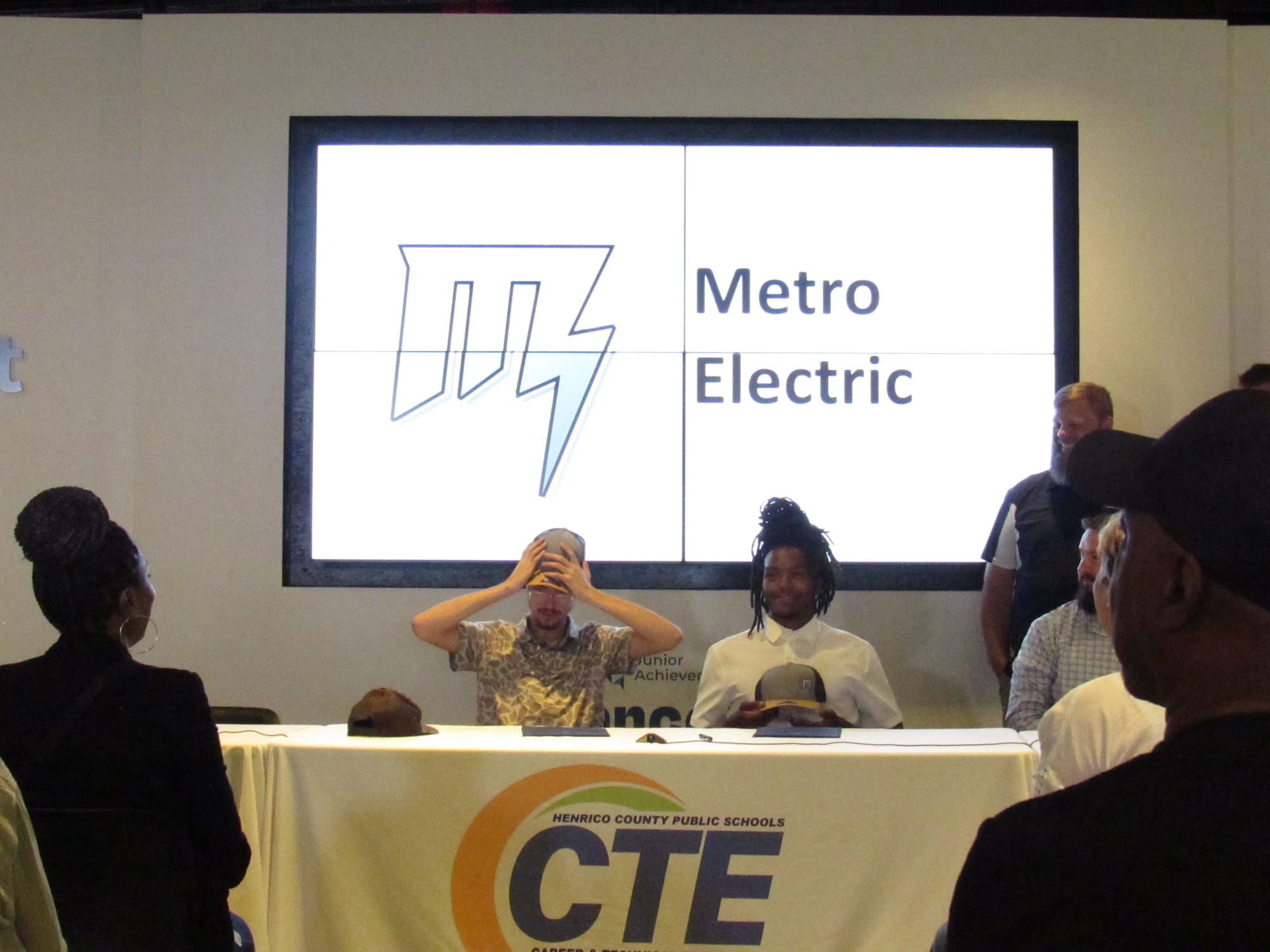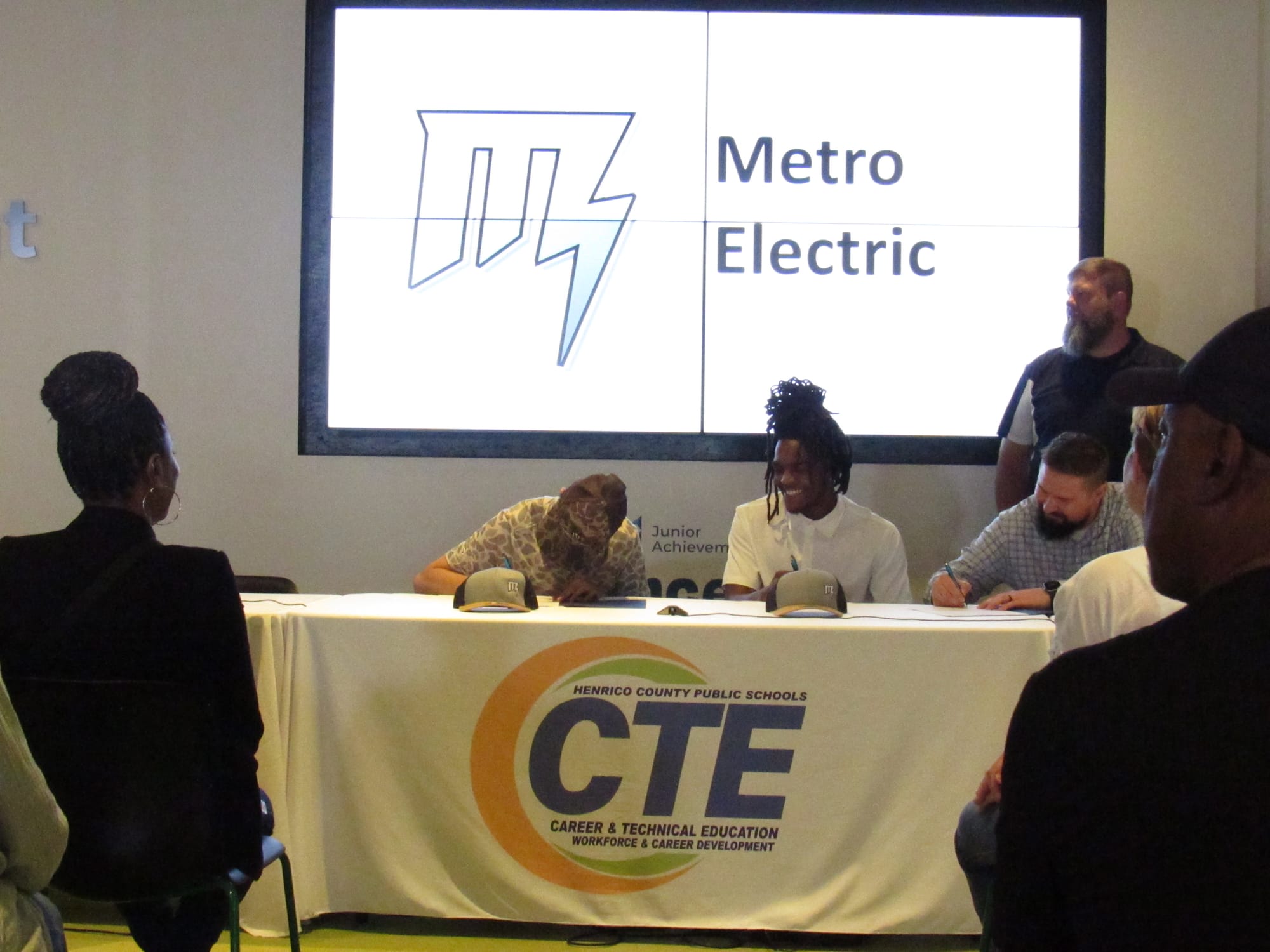 HCPS graduating seniors Bryten Mullins (left) and Tre Worthington (right) sign their new job contracts for Metro Electric. (Liana Hardy/Henrico Citizen)