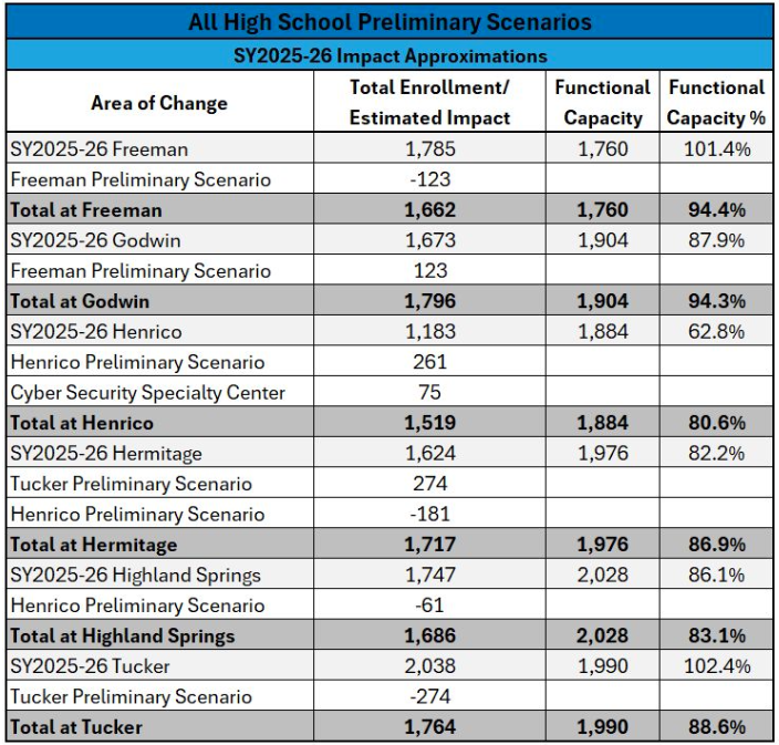 The Henrico scenario, which would increase the school’s capacity from 63% to 81% by bringing in students from either Hermitage or Highland Springs high schools, saw more than 70% of survey respondents in opposition, but most town hall attendees took a neutral stance.