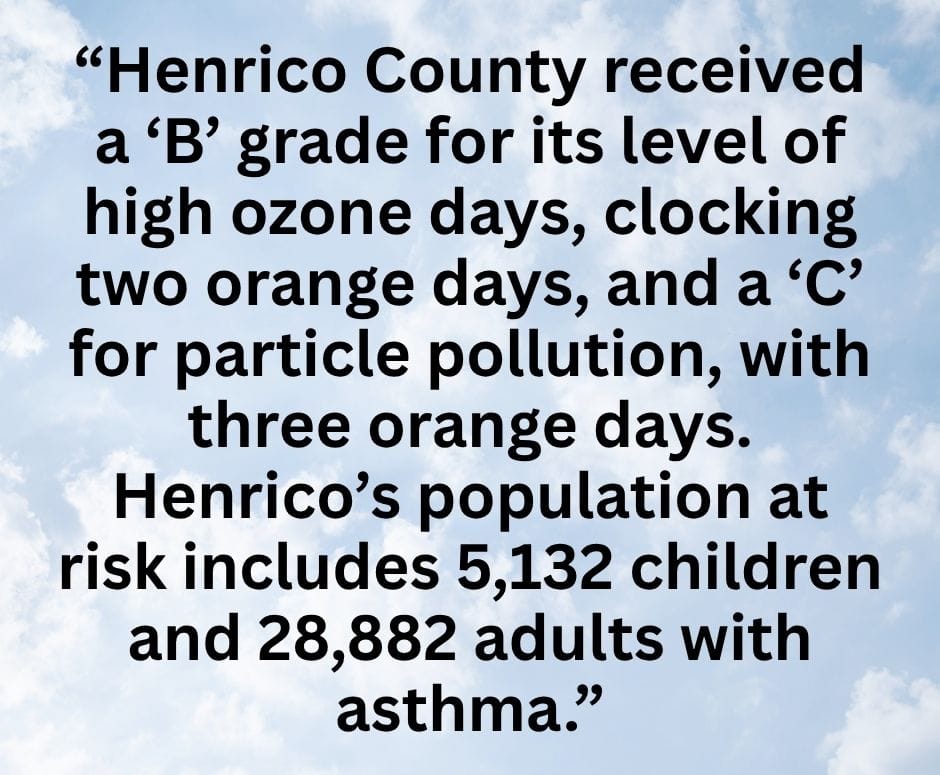 In the report, Henrico County received a "B" grade for the level of high ozone days, clocking two orange days. In the area of particle pollution Henrico earned a "C," with three orange days. Henrico’s population at risk includes 5,132 children and 28,882 adults with asthma, according to the report.