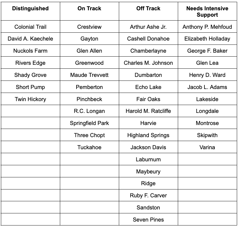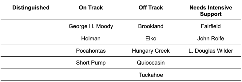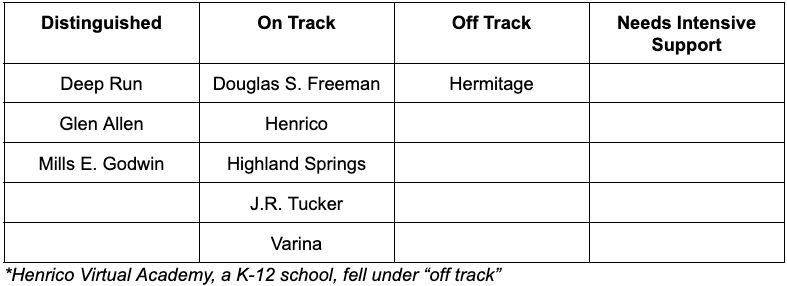 Across the state, about 65% of schools were ranked as “distinguished” or “on track” – but in Henrico, only 44% of schools fell into these categories. Ten Henrico schools were labeled as “distinguished,” 20 as “on track,” 24 as “off track,” and 14 as “needs intensive support.”