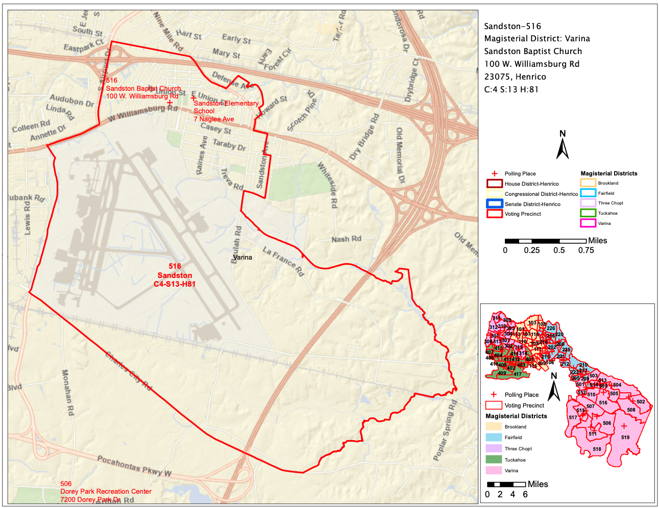 The Board of Supervisors of Henrico County proposes to change the polling place for the Sandston Precinct in the Varina District from Sandston Baptist Church to Sandston Elementary School (the “Proposed Change”). The Proposed Change would be made by an ordinance amending section 9-2 titled “Precincts and polling places” of the Code of the County of Henrico (the “Proposed Ordinance”).
