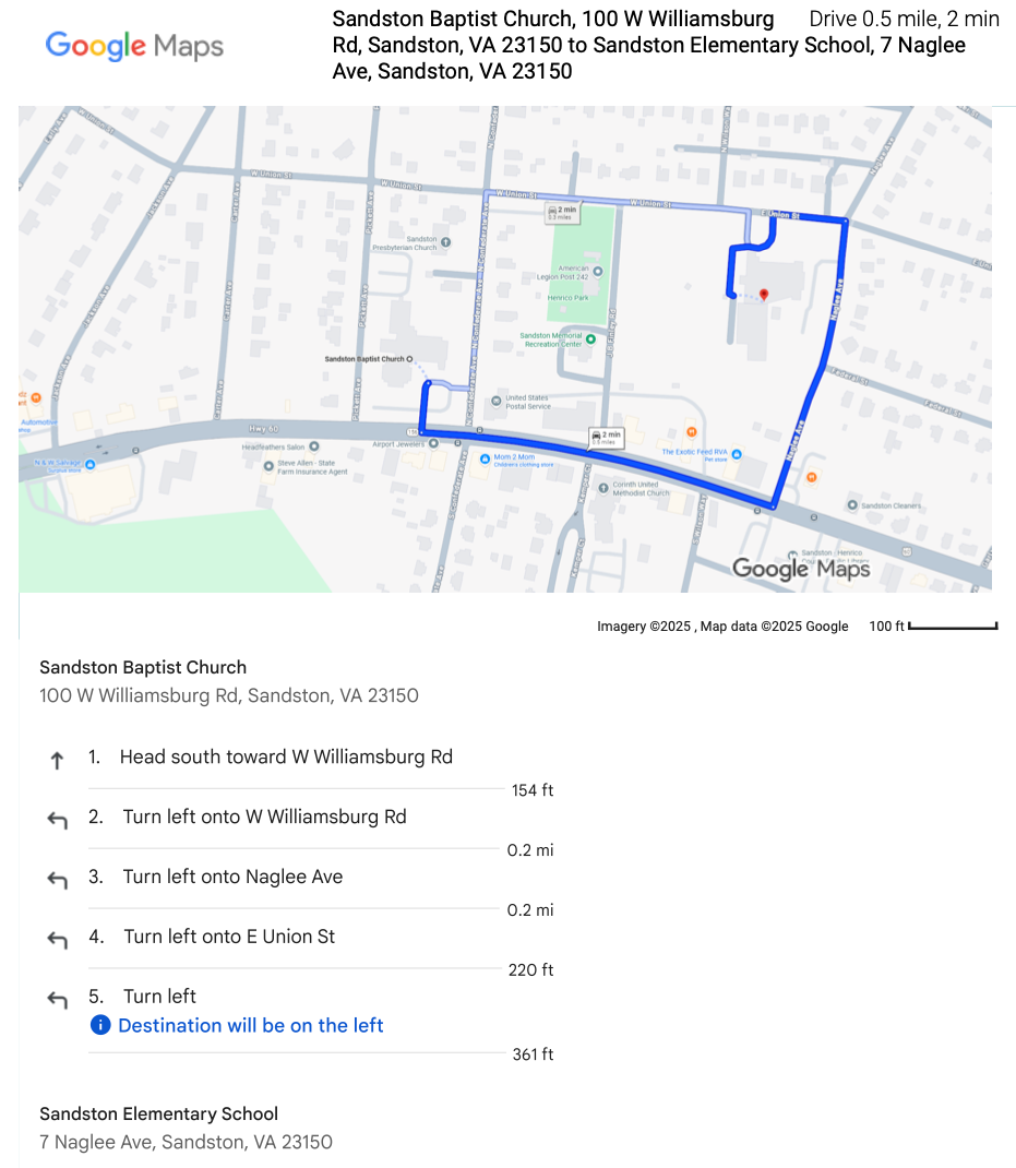 p. Sandston Precinct. Beginning at the intersection of Charles City Road and S. Airport Drive; thence northwardly along S. Airport Drive to its intersection with S. Airport Drive Extended (approximately 2,650 feet southwest of the intersection of S. Airport Drive and Williamsburg Road); thence northwardly along S. Airport Drive Extended to its intersection with Williamsburg Road (U.S. Route 60); thence eastwardly along Williamsburg Road (U.S. Route 60) to its intersection with S. Airport Drive (State Route 156): thence northwardly along S. Airport Drive (State Route 156) to its intersection with the Southern Railway; thence eastwardly along the Southern Railway to its intersection with East Nine Mile Road (State Route 33); thence southeastwardly along East Nine Mile Road (State Route 33) to its intersection with Bond Street; thence northeastwardly along Bond Street to its intersection with Algiers Drive; thence southeastwardly along Algiers Drive to its intersection with Defense Avenue; thence southeastwardly along Defense Avenue to its intersection with Seven Pines Avenue; thence southwardly along Seven Pines Avenue to its intersection with Howard Street; thence southwestwardly along Howard Street to its intersection with East Nine Mile Road (State Route 33); thence southwardly along East Nine Mile Road (State Route 33) to its intersection with East Williamsburg Road (U.S. Route 60); thence eastwardly along East Williamsburg Road (U.S. Route 60) to its intersection with Sandston Avenue; thence southwardly along Sandston Avenue to its intersection with Huntsman Road; thence eastwardly along Huntsman Road to its intersection with Seabury Avenue; thence southwardly along Seabury Avenue to its intersection with Treva Road; thence westwardly along Treva Road to its intersection with Beulah Road; thence southwardly along Beulah Road to its intersection with White Oak Swamp Creek (approximately 1,200 feet north of the intersection of Beulah Road and La France Road); thence southeastwardly along White Oak Swamp Creek to its intersection with Portugee Road; thence southwardly along White Oak Swamp Creek to a fork in the creek (approximately 400 feet west of the intersection of Poplar Springs Road and White Oak Swamp Creek); thence southwestwardly along White Oak Swamp Creek to its intersection with an unnamed stream (approximately 4,800 feet east of the intersection of White Oak Swamp Creek and Interstate Route 295); thence southwardly along the unnamed stream to its intersection with another unnamed stream; thence southwestwardly along this unnamed stream to its intersection with Charles City Road (approximately 2,000 feet east of the intersection of Turner Road and Charles City Road); thence northwestwardly along Charles City Road to its intersection with S. Airport Drive and the point of beginning. The polling place for Sandston Precinct is Sandston Baptist Church, 100 W. Williamsburg Road Sandston Elementary School, 7 Naglee Avenue.