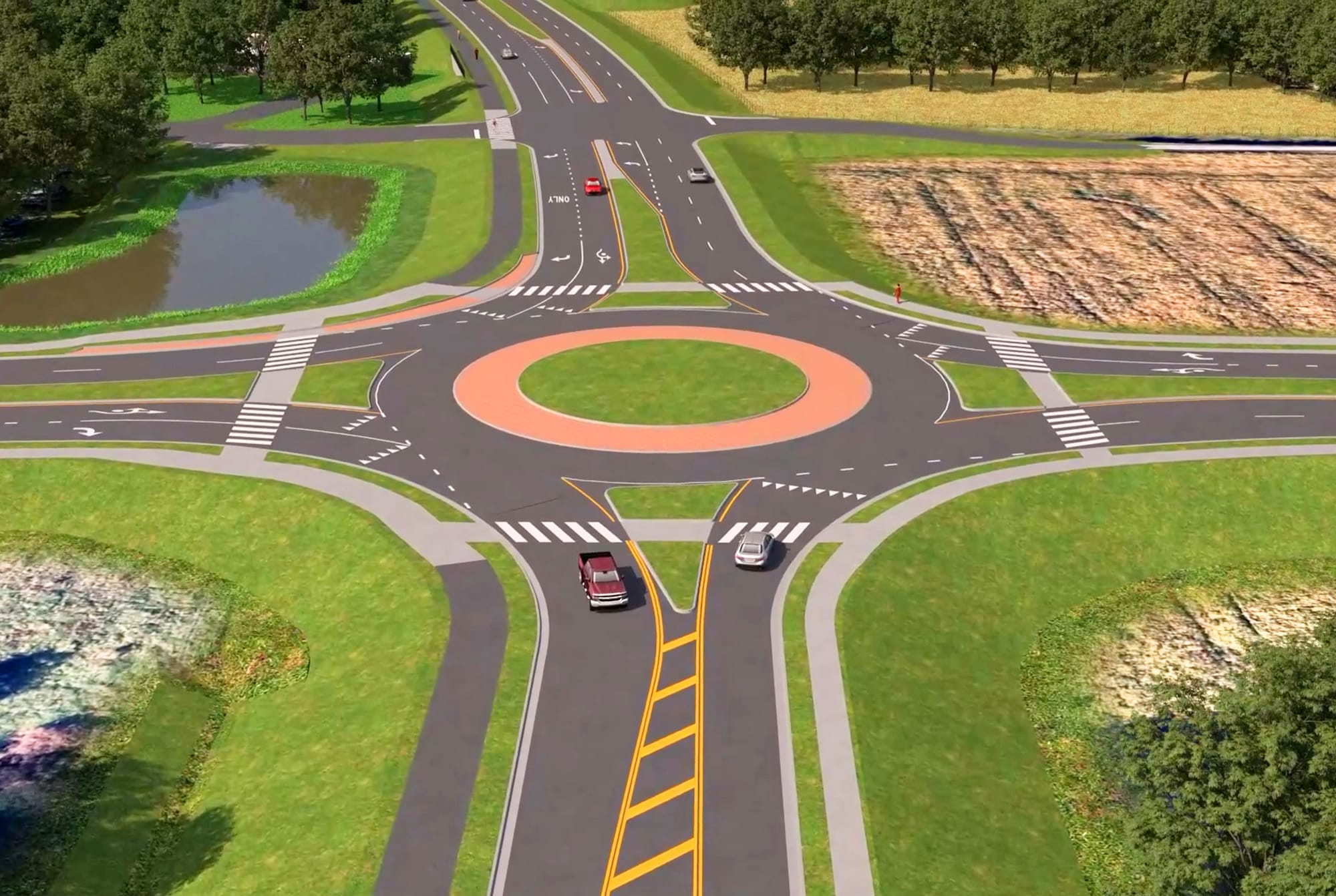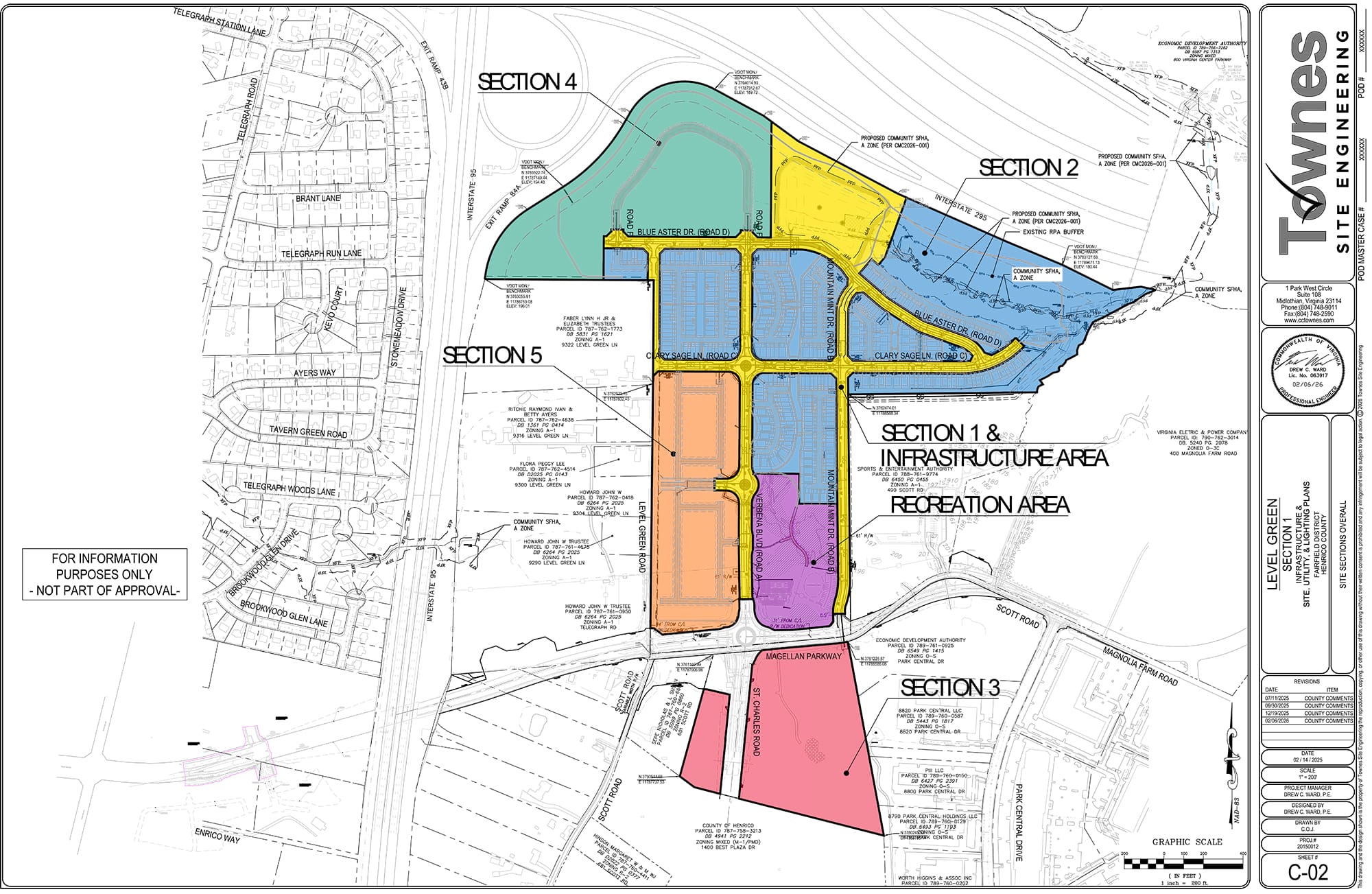 Plans for the new four lane bridge over I-95, connecting to an existing piece of Magellan Parkway, required coordination with the Virginia Department of Transportation. The road layout will include a new roundabout for the intersection at Scott and Level Green Road and for connections with the future St. Charles Road.