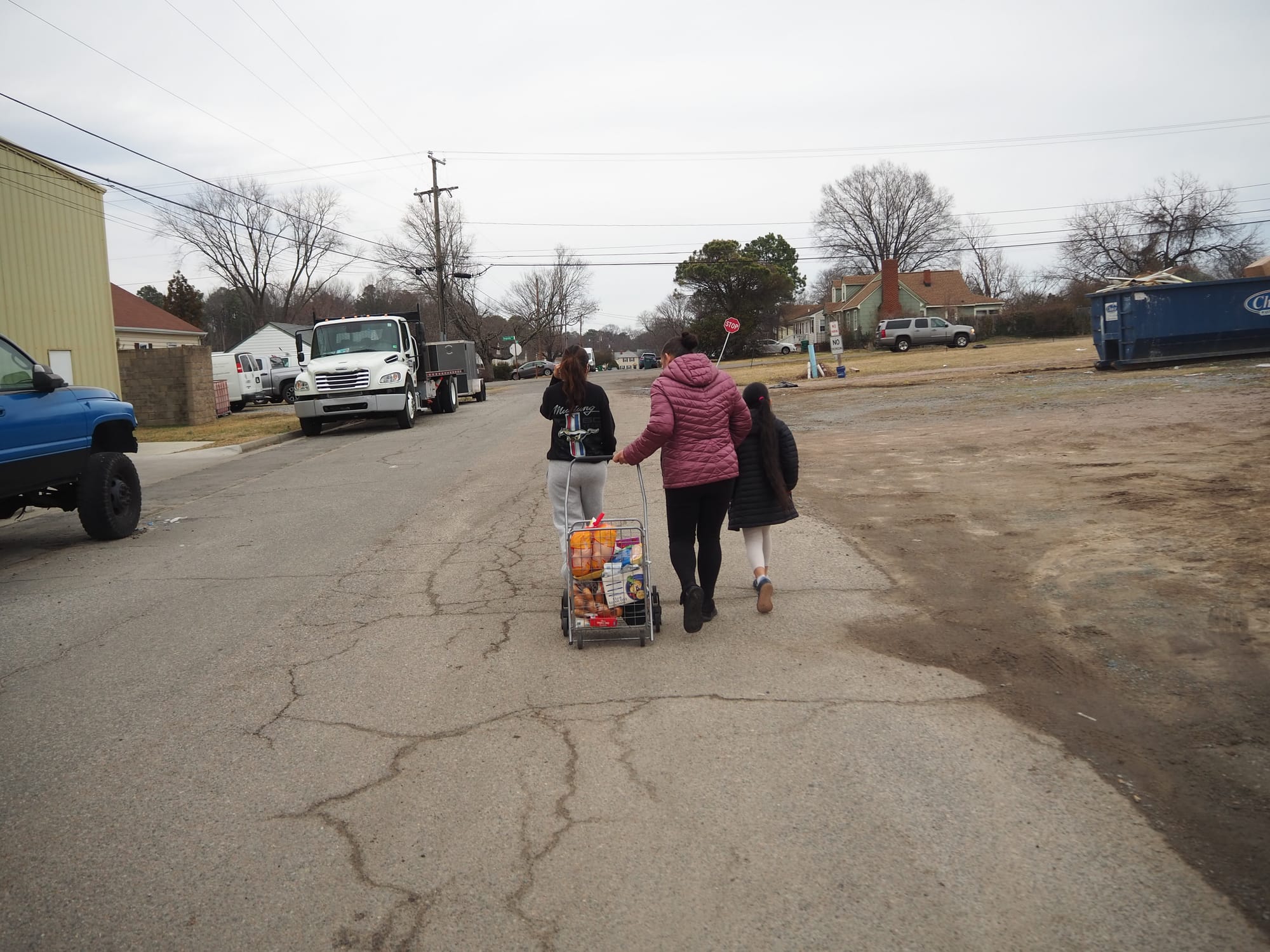 Scenes at the Islamic Circle of North America Relief food pantry during Ramadan: At left, food pantry coordinator Ajmal Hamza stands before a box with special Ramadan food items. Center, people wait outside the pantry for food. At right, family members walk home with food they received at the ICNA relief Wednesday food distribution. (Dina Weinstein/Henrico Citizen)