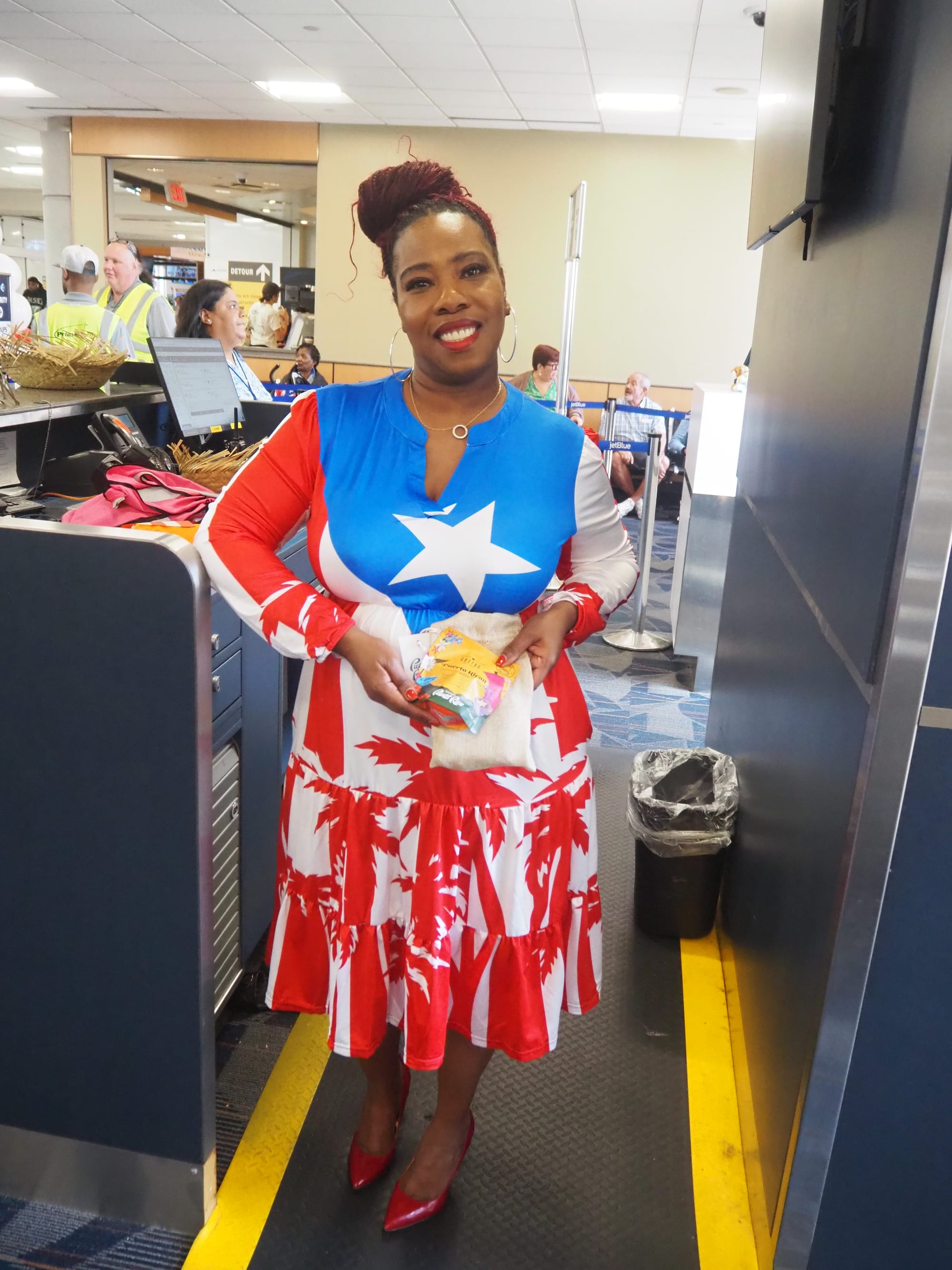 JetBlue General Manager for Richmond, Philadelphia and Norfolk airports Pamela Rivers, wore a red, white and blue dress in the style of the Puerto Rican flag with matching red heals.