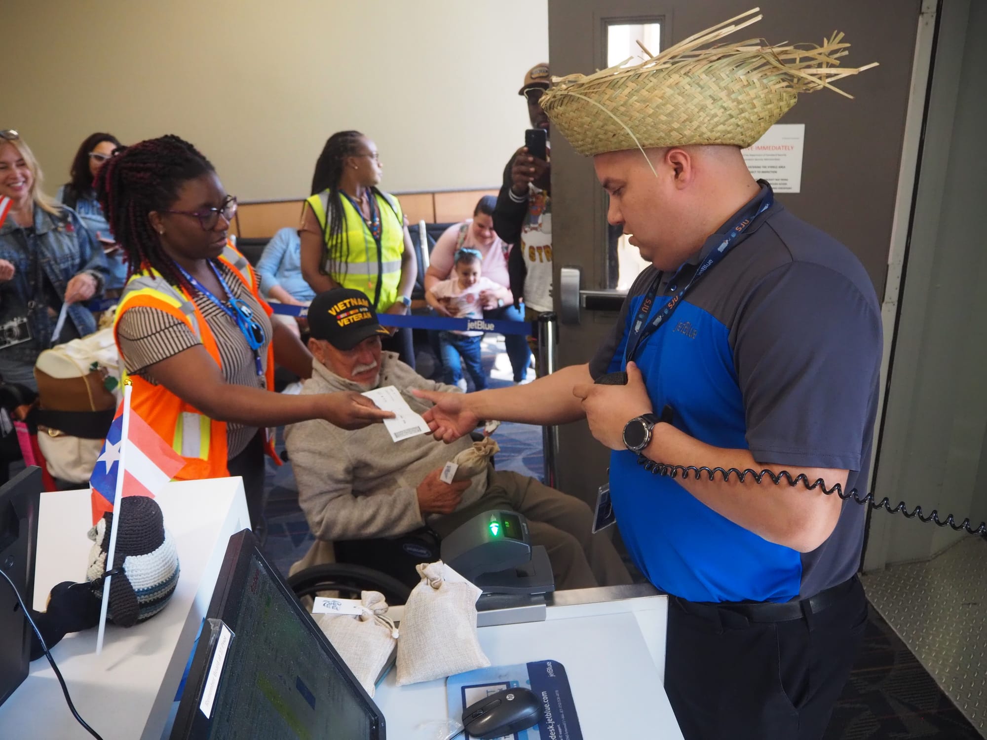 When Jim Rivera, JetBlue gate agent who wore a pava, the iconic Puerto Rican hat woven of palm fronds, asked the passengers in Spanish if they were ready to board the flight, there were whoops and applause.