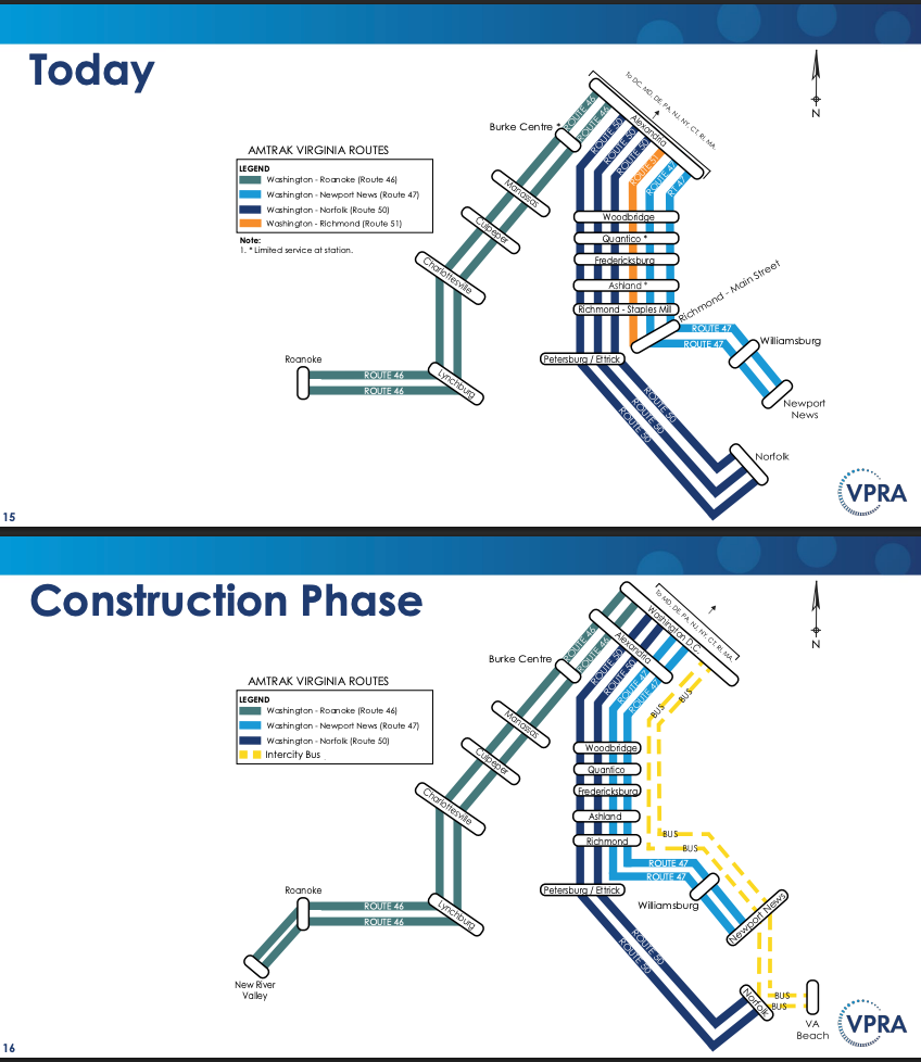 "There will still be two daily roundtrips between Washington D.C. and Norfolk and two daily roundtrips between Washington, D.C. and Newport News each day," Romero wrote to the Henrico Citizen in an email. "The two daily round trips from Newport News to D.C. will continue to call on Main Street and Staples Mill Stations. The two daily round trips from Norfolk will continue to call on Richmond Staples Mill as well [during the construction period]."