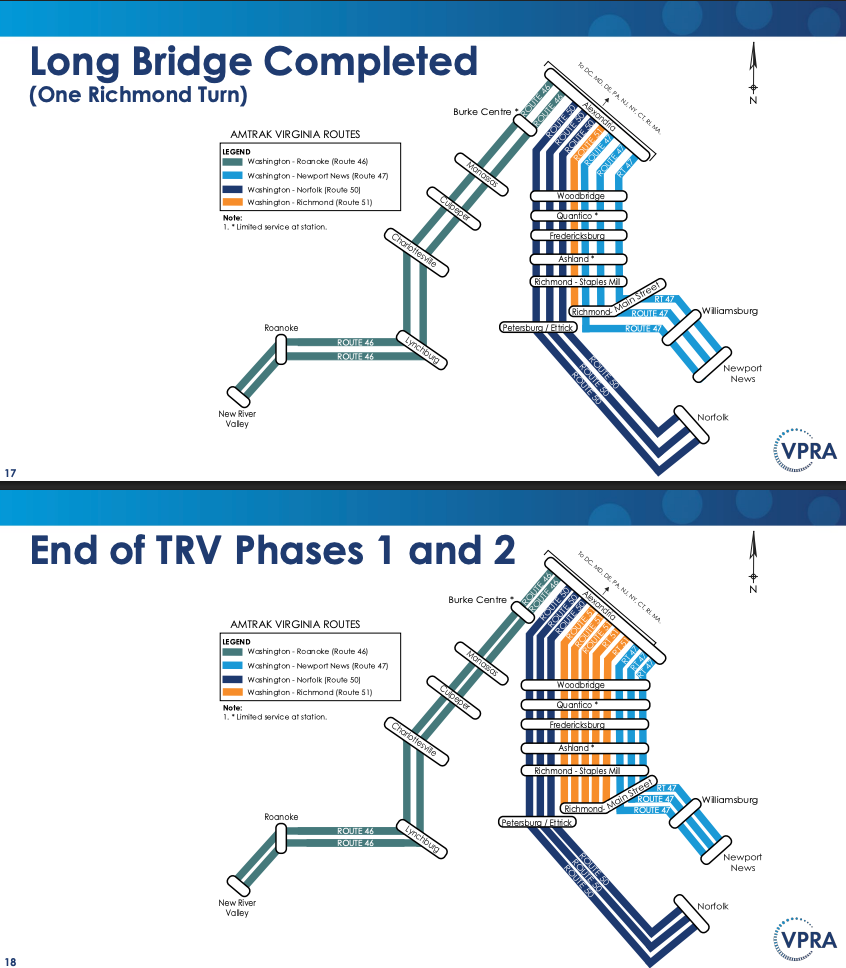 Graphics depicting the current Amtrak Virginia routes (upper left). The graphic on the lower left shows route changes during the Construction Phase of the Long Bridge, specifically how trains will stop at Main Street Station on their way to/from Newport News as they do today, but there will be less trains stopping at Staples Mill from Newport News and Norfolk because there will instead be express buses provided to and from those cities that will not stop at Staples Milll. The graphic on the upper right shows the train routes after the Long Bridge project is completed. The graphic on the lower right shows train routes at the end of the Transforming Rail in Virginia project completion. Images were presented during the VPRA October board meeting. (Courtesy VPRA)