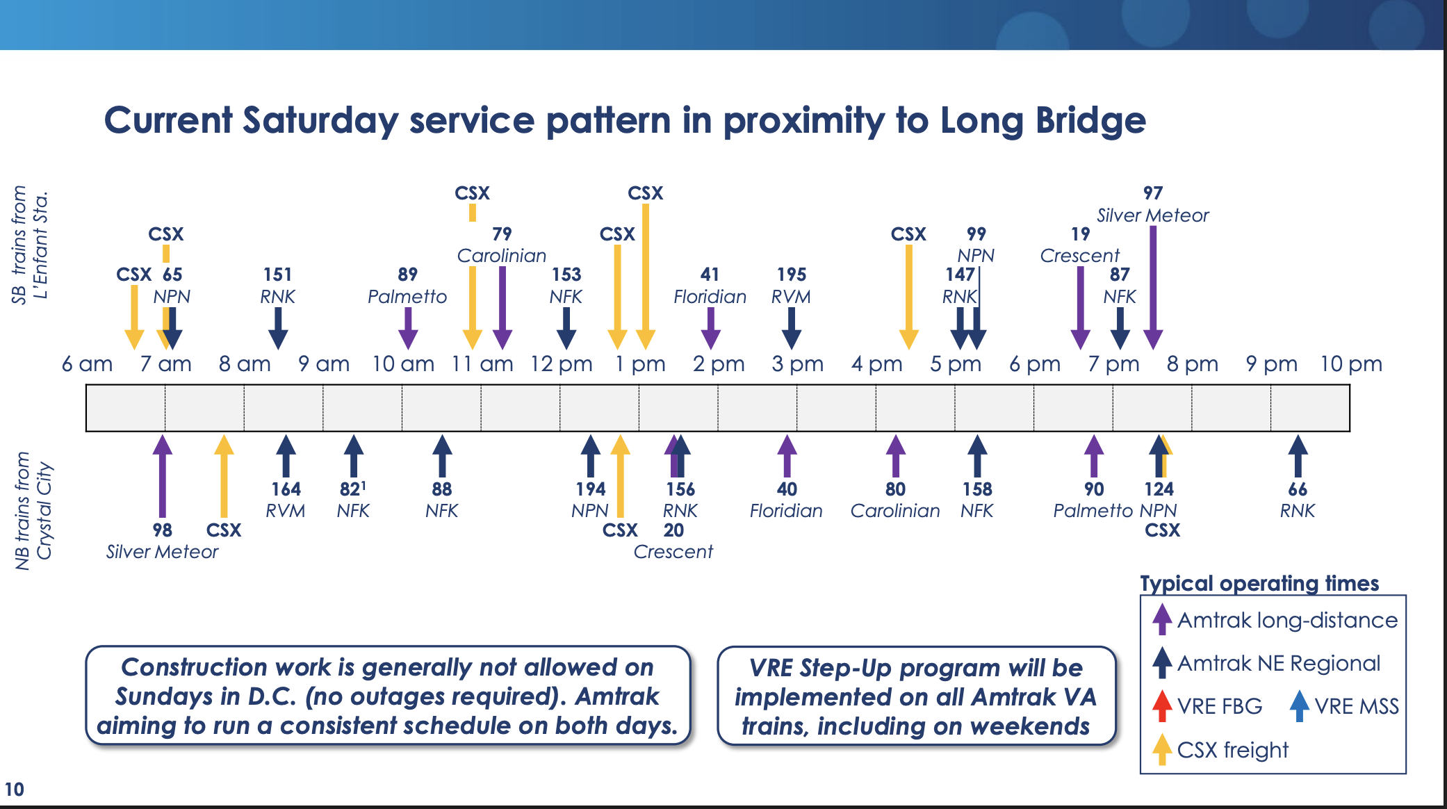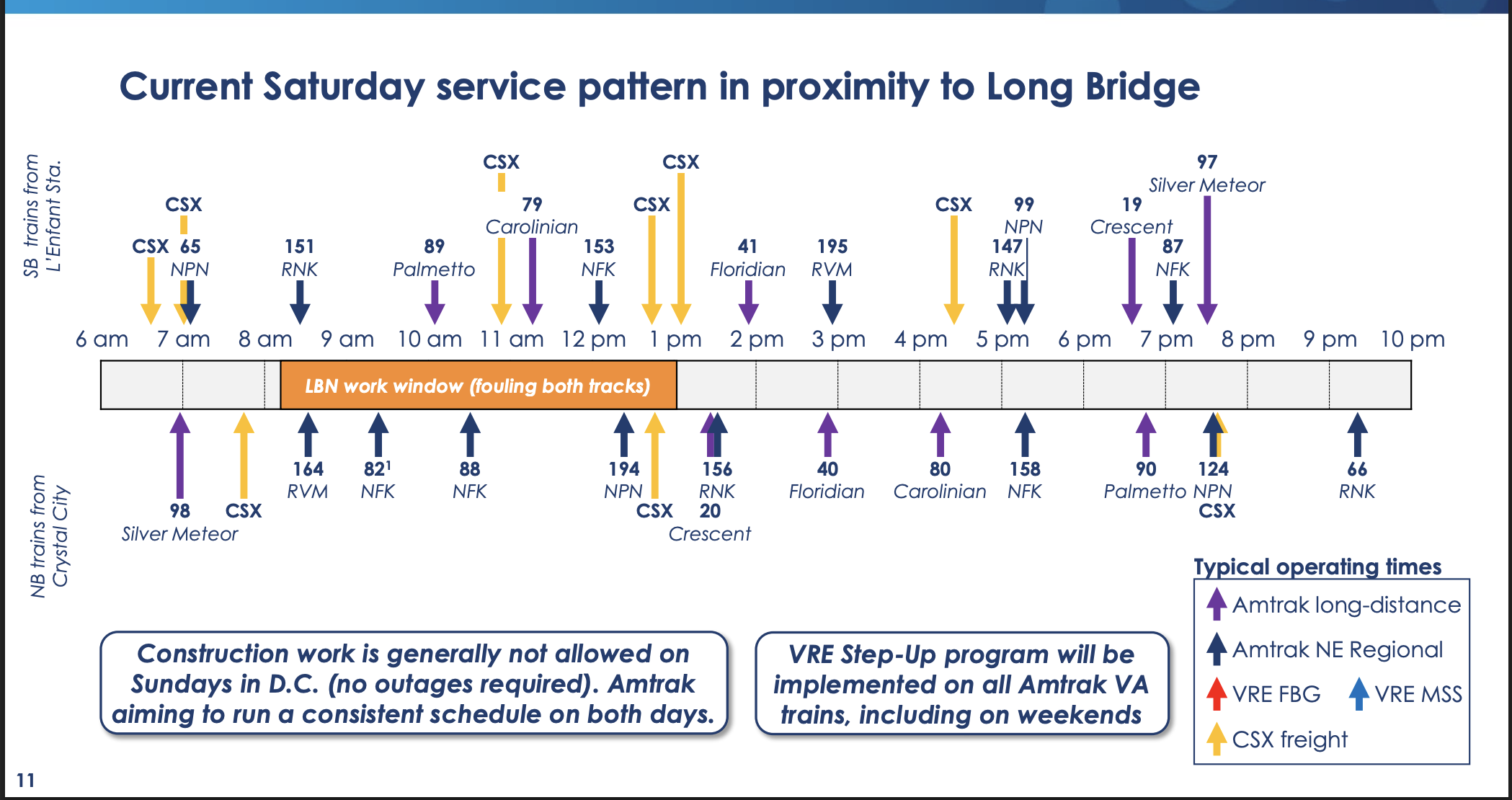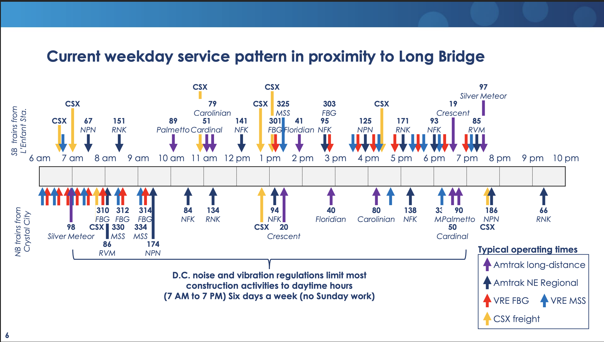 As the Long Bridge Project enters full construction, Washington, D.C. requires major construction activities to occur during daytime “work windows.” VPRA has coordinated service planning efforts with Amtrak, NCDOT, CSX, NS, and VRE, which have jointly developed a plan to preserve service.