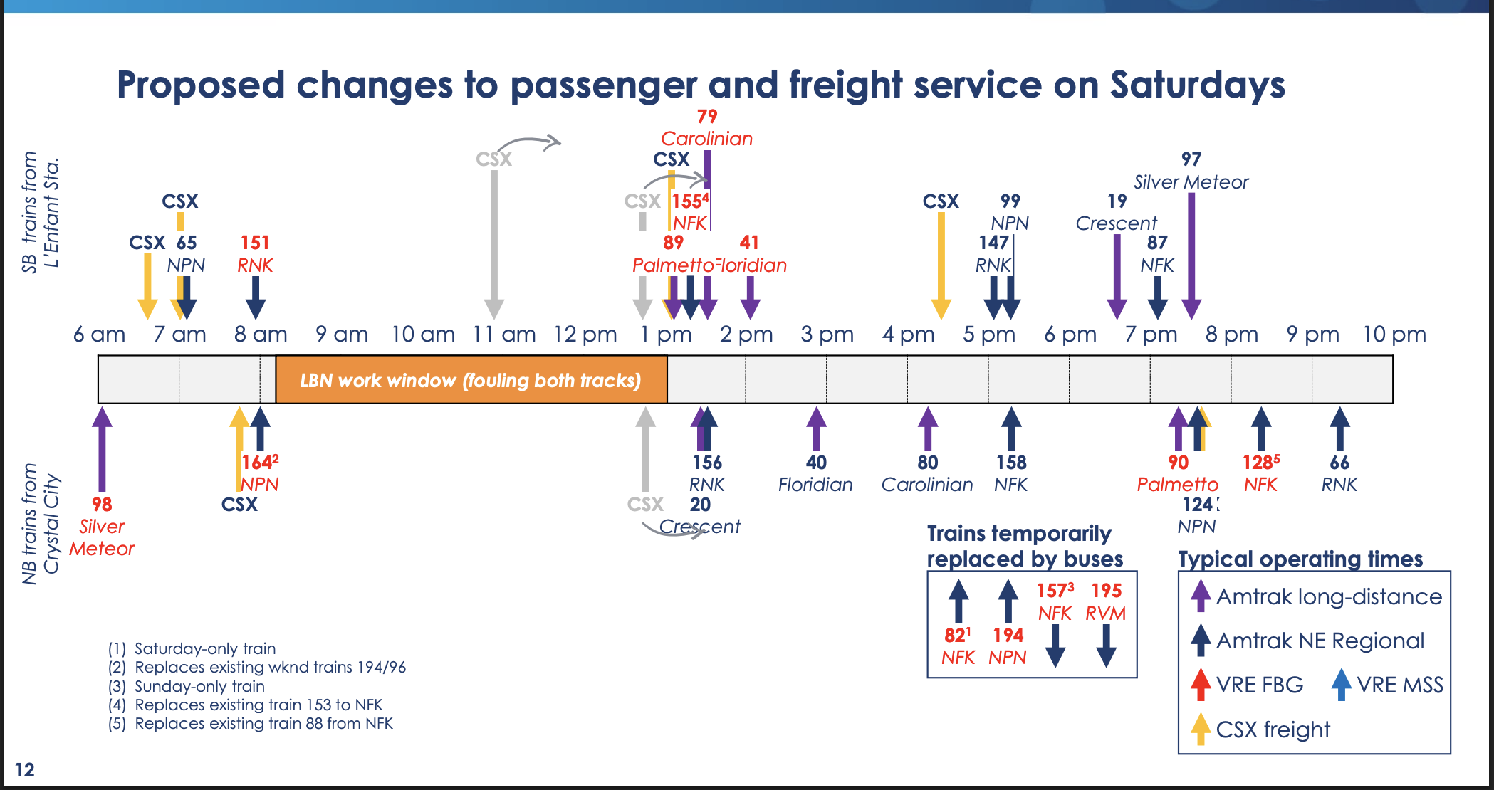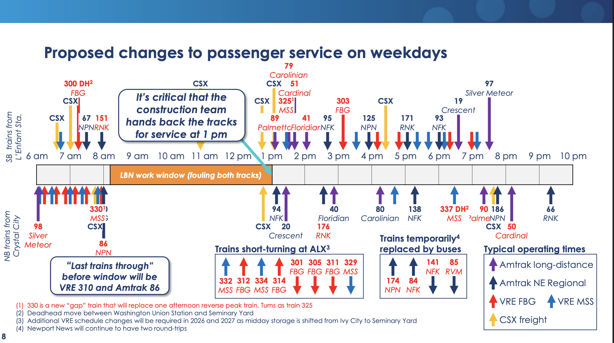 During the construction period, trains cannot enter from or leave Washington, D.C. southward between 8 a.m. and 1 p.m. So trains that currently are scheduled to arrive and leave Union Station between those times will be shifted earlier or later.
