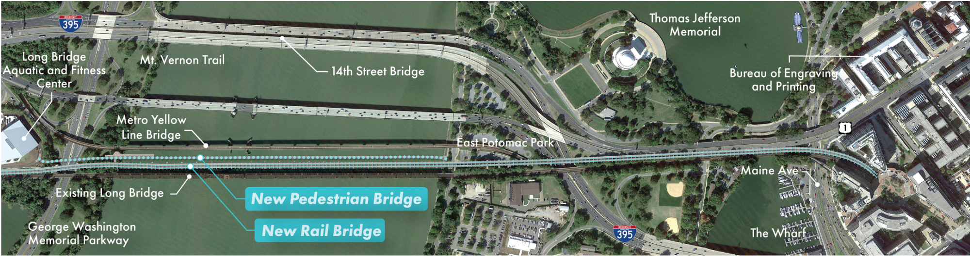 Virtual Flyover of the Long Bridge Project. This animation illustrates the planned new two-track rail bridge that will run parallel to the existing Long Bridge, as well as related improvements between Arlington and DC. Together, these enhancements will reduce congestion, support economic growth, and advance sustainable transportation across the region. (Courtesy VPRE YouTube channel)