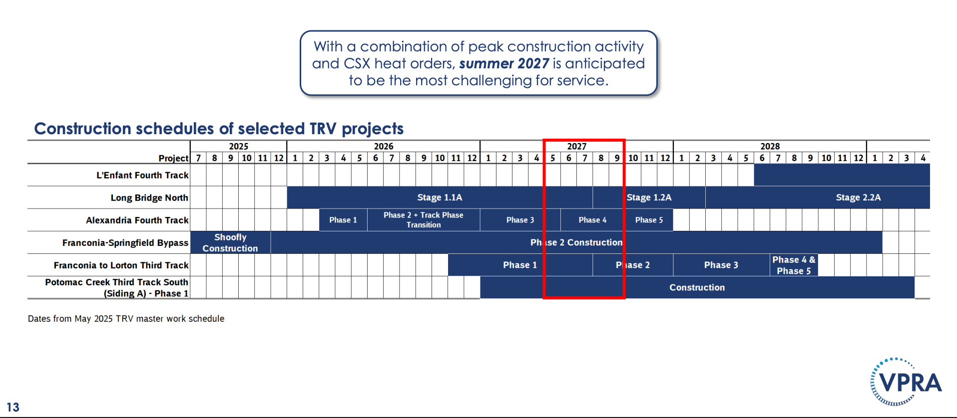 “While we are thrilled with the progress of the Long Bridge Project, we understand that these necessary service changes will be difficult for a number of our passengers,” VPRA executive director DJ Stadtler said in a press release. “We want those passengers to know that we did not take these decisions lightly, and we evaluated every possible scenario to limit the disruptions while providing our construction teams with the work window they need to safely complete the project on time and on budget. Our goal is to offer as much service as possible while working to upgrade our infrastructure, with the final result being more rail service throughout the Commonwealth.”