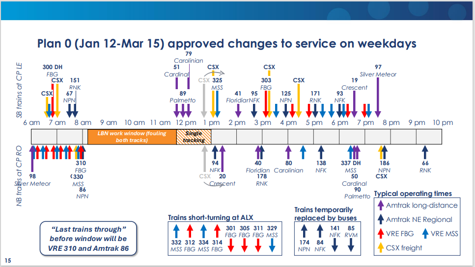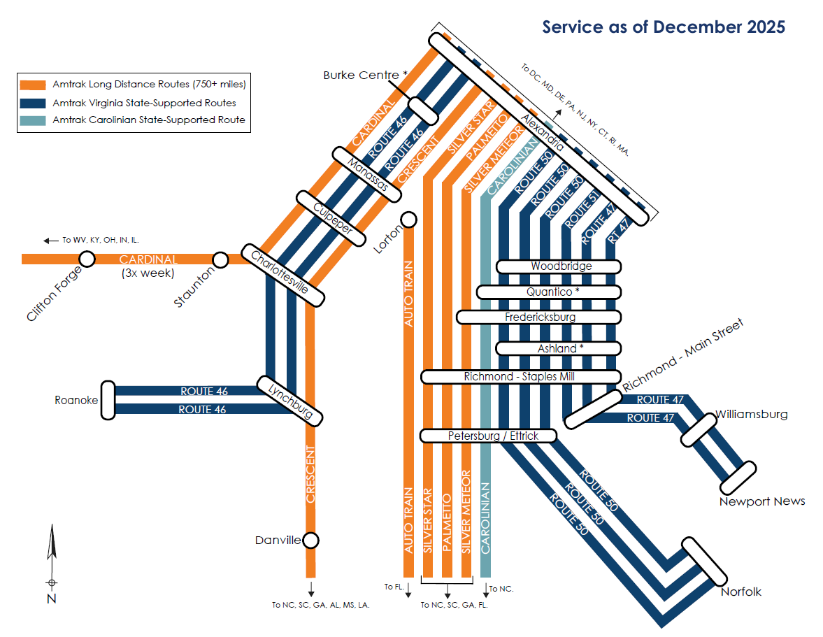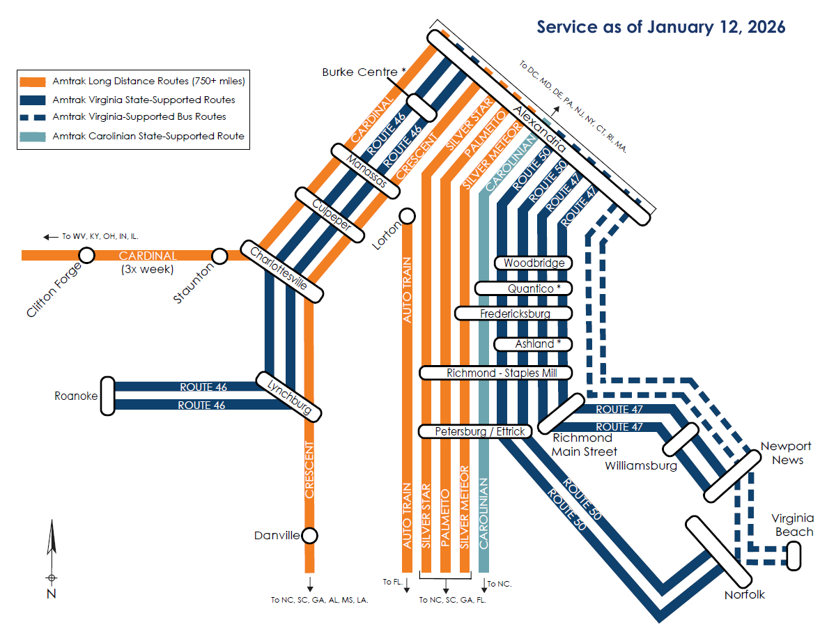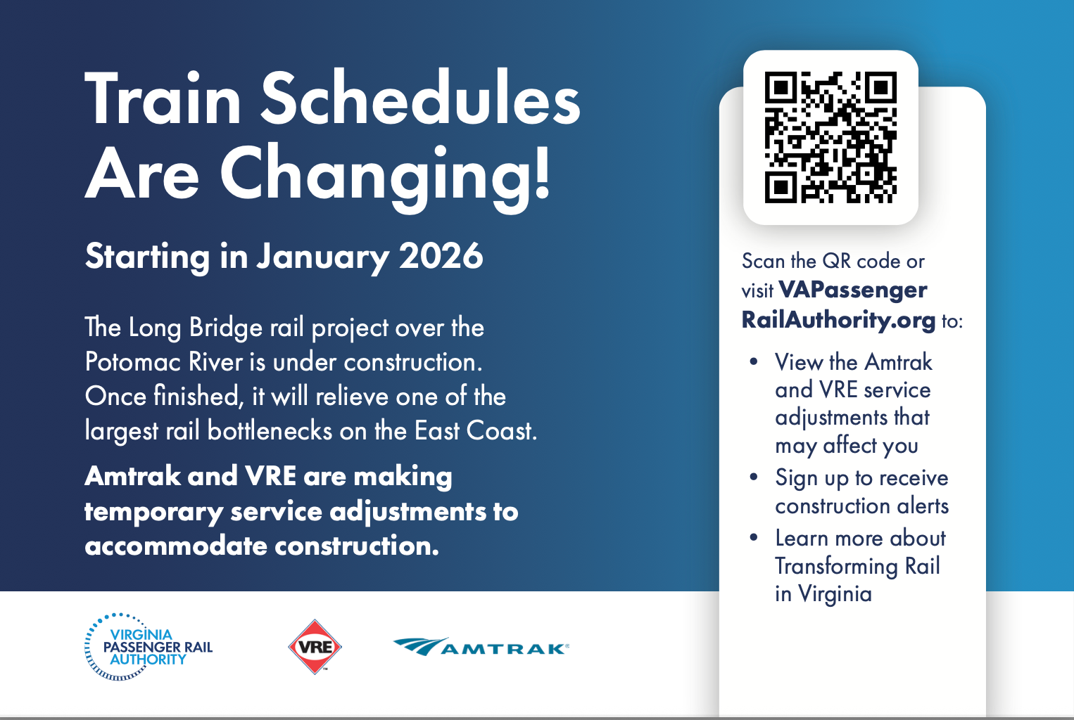 Graphic demonstrating the changes in Amtrak train service throughout Virginia including the Staples Mill station in Henrico County due to construction of the Long Bridge over the Potomac River. (Courtesy Virginia Passenger Rail Authority)