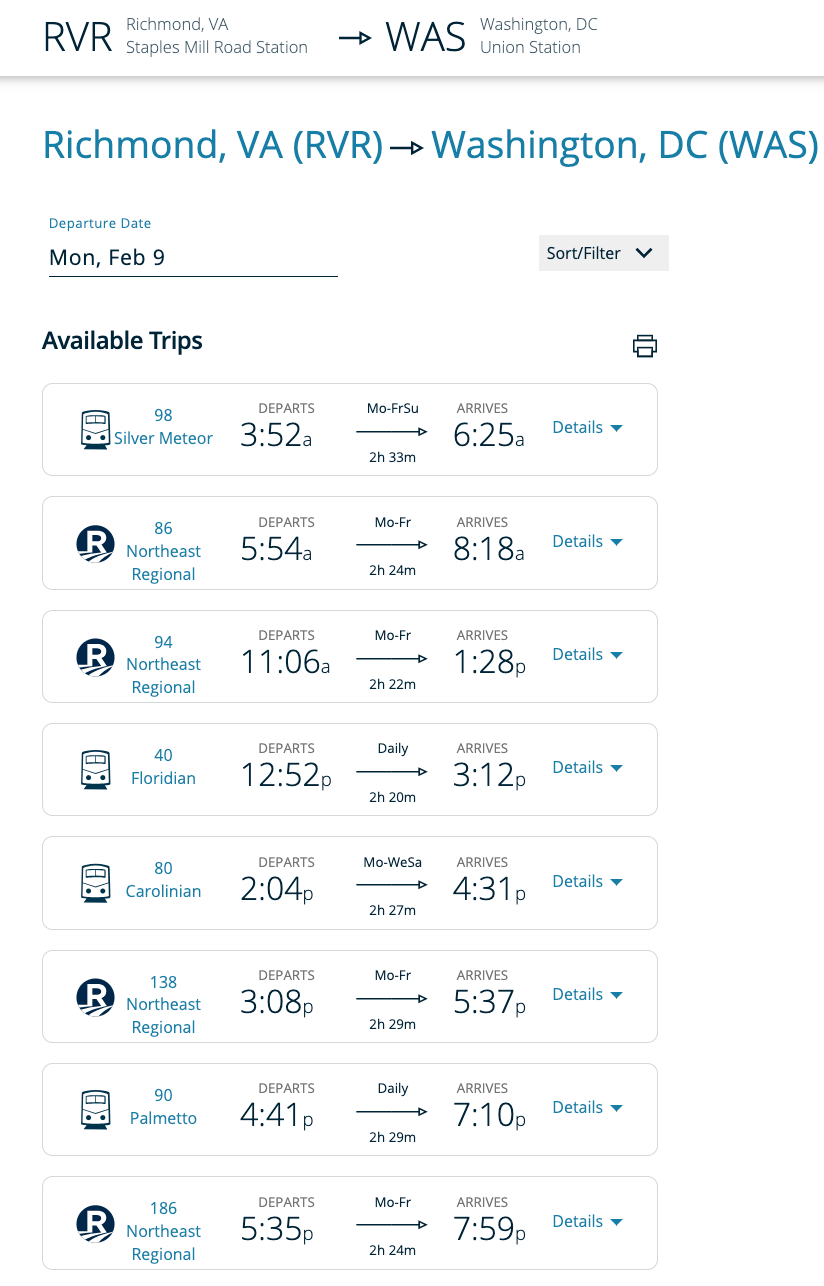 Screenshot of the weekday Amtrak train schedules from the Staples Mill station in Henrico County to Washington, D.C. Union Station.
