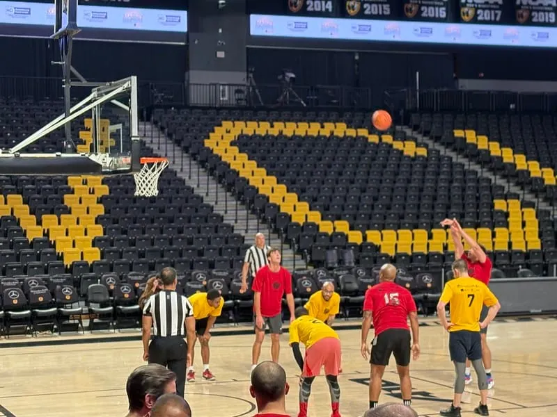 A member of the governor’s team shoots a free throw during a game against lobbyists Feb. 17, 2024 at VCU's Siegel Center. The governor's office won, 40-26. (Mekhi Wilson/VCU Capital News Service)